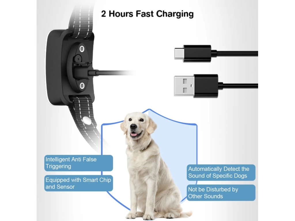 Kompletně programovatelný protištěkací obojek Patpet BC01 je moderní pomůckou pro odnaučení nežádoucího štěkotu vašeho psa. Obojek využívá pro korekci štěkání vzrůstající nastavitelné funkce zvuku, vibrace a impuls - citlivost na štěkot lze nastavit v pěti úrovních. Nabíjení pomocí magnetické nabíječky, voděodolný materiál a inteligentní barevný displej. Spolehlivý a bezpečný obojek je vhodný pro všechna plemena psů od 5 kg.